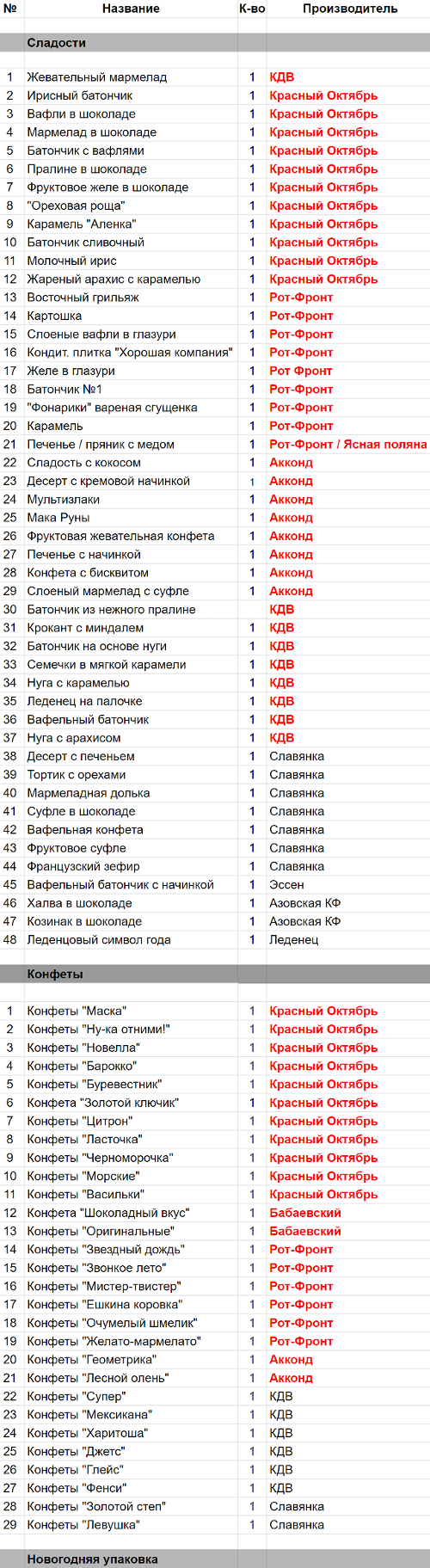 Ирисный батончик (1 шт), Вафли в шоколаде (1 шт), Мармелад в шоколаде (1 шт), Батончик с вафлями (1 шт), Фруктовое желе в шоколаде (1 шт), "Ореховая роща" (1 шт), Карамель "Аленка" (1 шт), Батончик сливочный  (1 шт), Молочный ирис (1 шт), Жареный арахис с карамелью (1 шт), Конфеты "Маска" (1 шт), Конфеты "Ну-ка отними!" (1 шт), Конфеты "Нива" (1 шт), Конфеты "Барокко" (1 шт), Конфеты "Буревестник" (1 шт), Конфета "Золотой ключик" (1 шт), Конфеты "Цитрон" (1 шт), Конфеты "Ласточка" (1 шт), Конфеты "Черноморочка" (1 шт), Конфеты "Морские" (1 шт), Конфеты "Васильки" (1 шт)