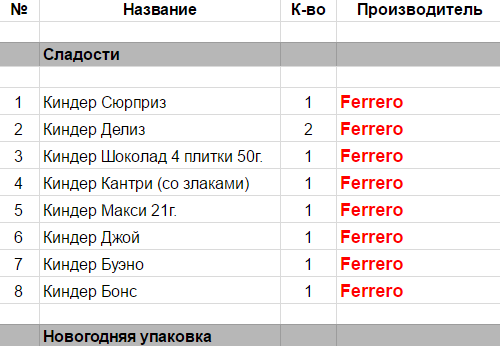 Киндер Сюрприз (1 шт), Киндер Делис (2 шт), Киндер Шоколад 4 плиток 50г. (1 шт), Киндер Макси 21 г. (3 шт), Киндер Кантри (со злаками) (2 шт), Киндер Джой (1 шт), Киндер Буэно (1 шт), Киндер Бонс (1 шт)